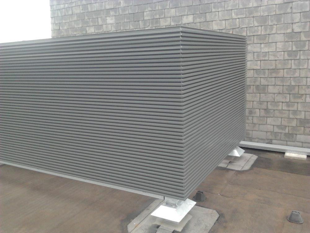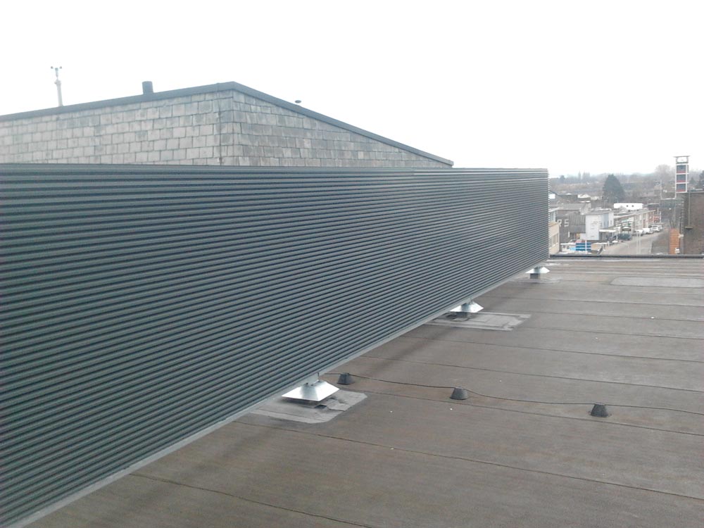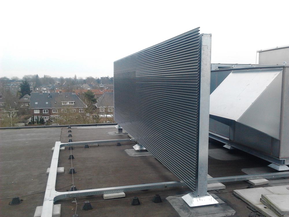 Zodoende besloot het bouwteam (opdrachtgever, architect en aannemer) om deze installatie, inclusief de kanalen op het dak, aan het zicht te onttrekken door middel van schermen.