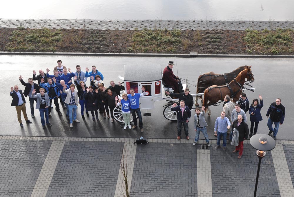 Beide jubilarissen werden bij wijze van verrassing 12 april per koets van huis gehaald en op kantoor ontvangen met felicitaties, koffie, gebak en cadeaus.