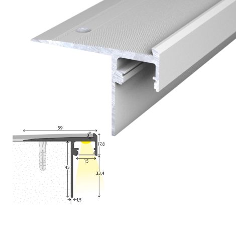 Deze profielen zijn uitgerust met LED-verlichting onder een hoek aan de zichtzijde van de trapneus. Hierdoor worden de randen duidelijk gemarkeerd, wat zorgt voor optimale zichtbaarheid en verbeterde veiligheid. Dit type verlichting is ideaal voor verduisterde ruimtes, zoals theaters en auditoria, waar juiste oriëntatie essentieel is, zelfs bij weinig licht.